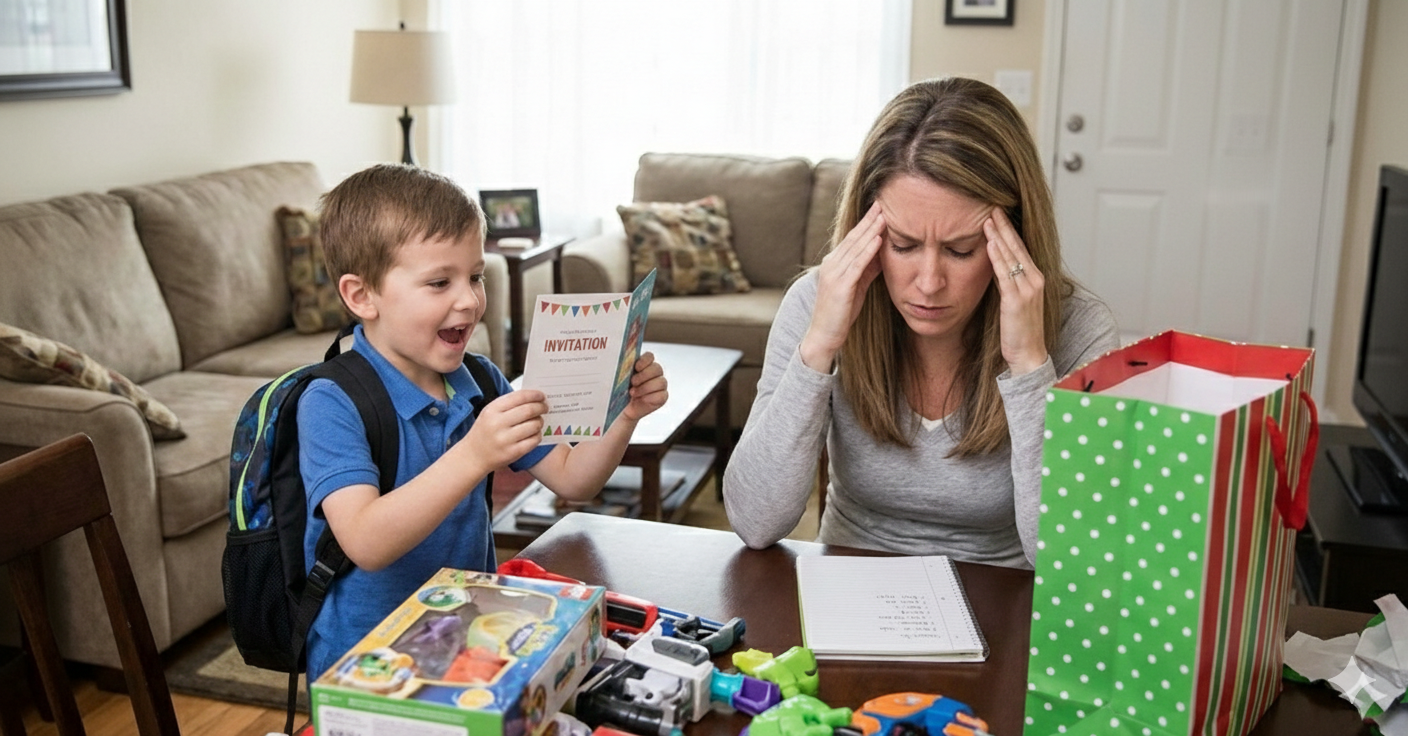 Love his excitement for his classmate's party! But figuring out the perfect gift is going to be a pain. It's surprisingly stressful! Anyone else feel this way?